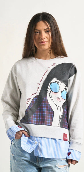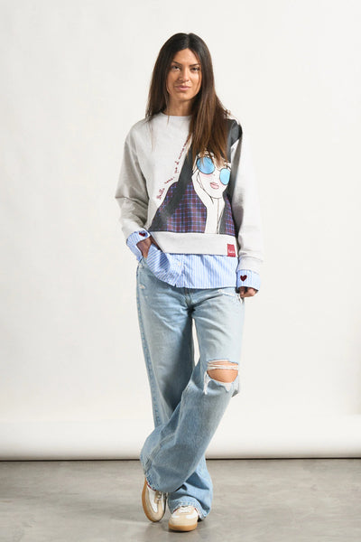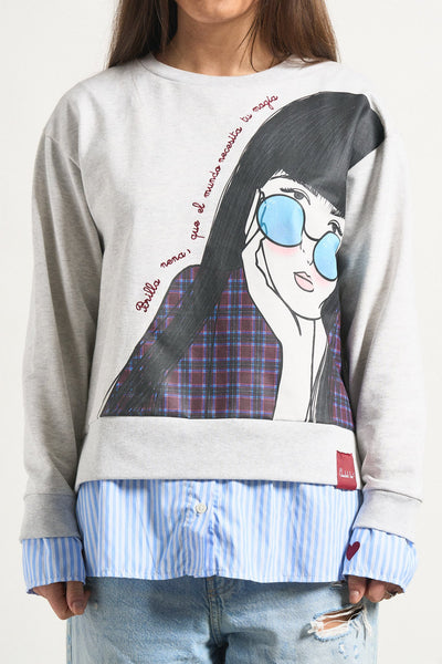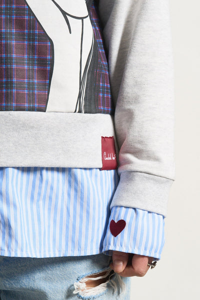 -Bajo de camisa popelín interior adherida en el cuerpo de la sudadera, con largos desiguales.